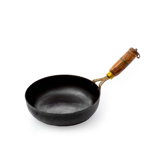 Seasoned Flat Iron Tadka Maker with Wooden Handle